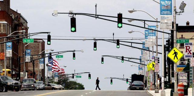 A pedestrian crosses the street on the west side of Newark, N.J., as green lights are seen on street signals, Wednesday, July 13, 2011. (AP Photo/Julio Cortez)